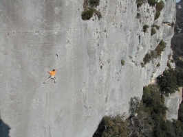 À droite, juste sous vos pieds, les immenses murs multicolores et les gros surplombs gris, naturellement criblés de trous de toutes tailles, ont fait de Buoux un spot mondial d’escalade. Dans les années 1980-90, ces falaises ont été le laboratoire du haut niveau international, où de nombreux grimpeurs se sont illustrés ; Patrick Edlinger, Antoine et Marc Le Menestrel, Catherine Destivelle, Lynn Hill, etc…