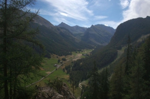 De temps en temps la forêt s’éclaircie pour nous offrir une vue aérienne sur la vallée. Les vallées dites en U ou en auge ont été formées durant les périodes glaciaires. Dans les Alpes, la dernière (-75000 à – 10000 ans) est appelée le Würm. L’action des glaciers a creusé les roches les plus tendres et charriée d’énormes quantités de matière. À leur retrait, ils ont laissé ces vallées glaciaires. L’écoulement des eaux crée aussi des vallées appelées fluviales.