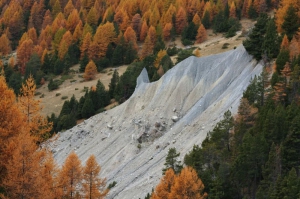 Les cheminées de Fée ou demoiselles coiffées sont formées d’une colonne faite de couches friables, sableuses et caillouteuses et d’une roche plus solide qui recouvre la colonne et qui finit par tomber. Ici la coiffe est partie. Alors comment se forment ces cheminées ? Deux théories s’opposent (Cf. randonnée VTT le canal de Pierre dimanche pour la seconde théorie). Certains géologues pensent que la coiffe posée sur la colonne empêche l’eau de remonter par capillarité. Ce phénomène favorise le dépôt des minéraux contenus dans l’eau et cimente les sédiments présents sous la roche protectrice. Les colonnes seraient donc déjà formées dans le sol et l’érosion les découvrirait petit à petit
