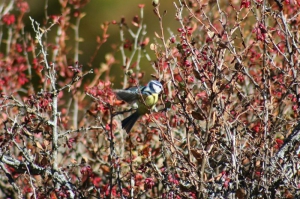 Suspendue au sommet d’un arbre ou d’une branchette, la mésange bleue se nourrit de petits insectes, de larves, de chenilles, d’araignées et d’invertébrés. La branche nettoyée, la mésange passe à la suivante. A l’occasion, elle peut consommer des fruits et des graines. La femelle fait son nid dans un trou d’arbre ou la cavité d’un mur. Elle couve 7 à 13 œufs pendant une quinzaine de jours durant lesquels le mâle la nourrit. Les petits seront entièrement dépendants de leurs parents leur premier mois de vie.