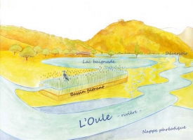 Le système hydraulique du plan d’eau de baignade du Pas des Ondes reproduit un fonctionnement naturel. L’eau y circule en continu depuis la rivière de l’Oule, avec un débit de 30 L/s., et transite d’abord par un bassin de décantation. Ce bassin a pour rôle de filtrer et de capter les particules fines de limon en suspension, afin de limiter la turbidité et de préserver la clarté de l’eau de baignade. Après avoir traversé le lac réservé à la baignade, l’eau s’écoule dans le plan d’eau dédié à la pêche, avant de rejoindre à nouveau l’Oule.