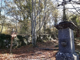 Apparues dès le XIe s., les croix de chemin servaient à christianiser l’espace. Implantées aux croisées des routes ou aux abords des villages, elles guidaient et protégeaient les voyageurs. Celle visible sur cet itinéraire est typique : une base en blocs de calcaire massifs, surmontée d’une croix en fer forgé et d’un petit bénitier. Elle daterait du XVIIIe s.