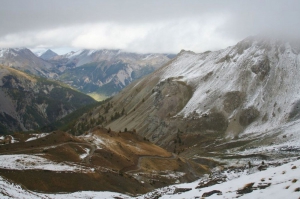 Vue depuis le col de Furfande (2500 m) sur la vallée d’Arvieux. À l’horizon, apparaissent le col d’Izoard (2360 m), l’Arpelin (2604 m) et le Lasseron (2702 m). Sur la droite, la crête de Côste Belle se devine entre les nuages. Au premier plan, la crête de la Plate joue elle aussi à cache-cache.