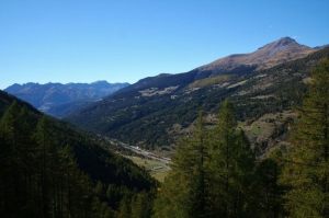 En remontant la piste forestière, des vues sur la vallée du Guil se dévoilent. Au fond, on peut voir les crêtes de la Plate et de Croseras, délimitées par la caractéristique Dent du Ratier (2660 m). Sur la droite, plus proche, le pic de l’Agrenier (2793 m) surplombe la vallée du Guil.