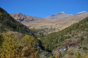 Belle vue sur le vallon du Lombard. On voit à droite le Serre de l’Aigle (2496 m) et le Petit Rochebrune (3078 m) au fond du vallon.