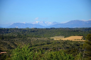 Point de vue sur le plateau de Valensole et les sommets des Alpes du sud. “Alpes” dérivent de la racine linguistique : alm-, alp ou alb que l’on rattache à l’idée de “montagne”. Plus précisément il semble que les mots composés à partir de cette racine désignent initialement une plaine ou un plateau enserrés entre des chaînes de montagnes. On pense immédiatement à la définition d’un “alpage”.