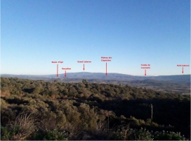 De gauche à droite sont bien visibles, Roussillon au premier plan, puis au fond le Mourre Nègre (1125 m) sommet du Grand Luberon, la combe de Lourmarin, le Mourre de Cairas point culminant du Petit Luberon (727 m). Les formes du relief correspondent à l'architecture géologique du sous-sol. Un grand anticlinal (pli en forme de voûte), orienté est-ouest, forme la montagne du Luberon entre Cavaillon et Volx, encadré au nord et au sud par les synclinaux (pli en forme de cuvette) du bassin d'Apt et de la Durance.