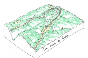 Entre Ventoux et Luberon, le massif calcaire très boisé des Monts-de-Vaucluse s'ouvre sur de rares parcelles agricoles. La présence contemporaine de l'homme est discrète mais la grande richesse du patrimoine de pierres sèches rappelle sa présence historique. Un réseau de petites routes sinueuses et d'anciens chemins muletiers vient desservir les villages perchés adossés au massif. Ces routes, ponctuées de remarquables chênes, renforcent le caractère bucolique de cette campagne qui parait figée comme hors du temps.