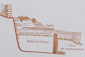 Le climat provençal est rigoureux, fait d'alternance de rares précipitations souvent orageuses et de sécheresses relativement longues. L'eau étant donc très rare, ici les eaux de pluie qui s'infiltrent sur le versant amont sont récupérées dans une citerne creusée dans le rocher. À l'abri d'une dalle en pierre, ce bassin couvert pouvait stocker jusqu'à 20 m3 d'eau.