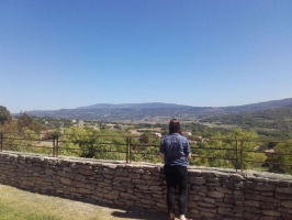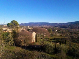 Devant nous se dessine au loin sur près de 60 km de long et 5 km de large, le Grand Luberon côté est, avec son point culminant, le Mourre Nègre (1125m), puis le Petit Luberon côté ouest. Entre les deux, la combe de Lourmarin qui dévale plein sud derrière le village de Bonnieux que l'on devine aisément juste en face. Le Luberon, la "Montagne du Loup", selon l'une des explications toponymiques, a donné par extension son nom à toute la région environnante. Jean Giono aimait à l'appeler "la Baleine Bleue", d'après la forme et la couleur que le massif prend certains jours.