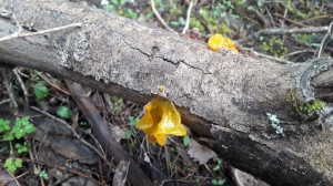 La Trémelle mésentérique (Tremella mesenterica) est un champignon jaune translucide qui se développe sur le bois mort et parasite d’autres champignons (du genre Peniophora) pour vivre. Appelé « beurre de sorcière » la trémelle s’aperçoit facilement après des périodes de pluie, quand elle est gorgée d’eau. Elles se déshydratent en période sèche. C’est une espèce pérenne mais elle est davantage visible à la fin de l’automne et en hiver. Ce champignon n’est pas classé comme toxique mais n’a pas d’intérêt culinaire.