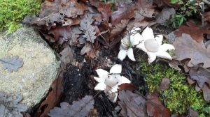 Cette étoile de terre est un champignon appelé géastre à trois enveloppes (Geastrum triplex ou michelianum). D’abord en forme d’oignon, il se déchire ensuite en étoile à plusieurs branches reliées à une boule renfermant les spores. Le géastre à trois enveloppes se plait dans des forêts de feuillus ou de conifères et apprécie les sols calcaires. Ce champignon se nourrit de matières organiques en décomposition et est plus fréquent en été et en automne. Attention, il n’est pas comestible !