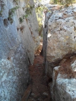 À proximité de la chapelle se trouve le seul passage qui permet de franchir la barre calcaire. Il se faufile entre celle-ci et une lame de roche détachée du plateau. L'homme utilisait ce passage. Remarquez les traces d'ancrage sur la paroi rocheuse, et sur le plateau, creusé dans le rocher, les traces sommaires d'habitations.