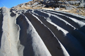 Ces érosions en forme de rigoles parallèles sont créées par l’action de l’eau. L’eau répandue sur une surface reste un ensemble plus ou moins compact. Elle ne va pas avoir un étalement homogène mais former des « taches » et rester au maximum liée. Sur une surface en pente, l’eau garde cette consistance et s’écoule selon des lignes. Ella va progressivement creuser le calcaire selon son chemin. Une fois que la cannelure commence à se creuser, l’eau se retrouve piégée dans cette micro rigole et poursuit son érosion.
