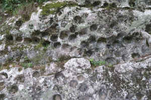 Une curiosité géologique sur le parcours de découverte que ces petites cavités dans la roche. Le randonneur averti sait bien qu’il y a environ 15 millions d’années, la région était recouverte par une mer chaude qui a déposé d’importantes couches sédimentaires au gré de ses fluctuations. Ces calcaires coquillers, regorgent, par endroits de fossiles de pectens, coquilles d’huîtres, dents de requin ET…. d’oursins. Ici, les cavités ont été creusées par des oursins sur le substrat calcaire, au fond de la mer… Vu la quantité d’empreintes présentes sur ce site, on pourrait presque croire à une oursinade organisée dans le secteur. Par qui ? Je laisse libre cours à l’imagination des petits et des grands…