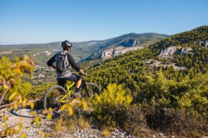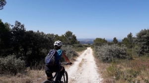 Il n'est pas rare ici de croiser des vététistes. Eux comme vous apprécient particulièrement déambuler sur les sentiers multiples de Lagnes, s'imprégner en chemin du patrimoine naturel et culturel, puis admirer les vues somptueuses comme ici sur la colline Saint-Jacques tout au loin. Alors si les piétons, cavaliers et trailers sont toujours prioritaires sur les VTT ou VTTae, je reste attentif en leur présence et courtois avec tous les autres usagers. J'adopte la Luberon attitude !