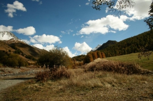 Vue vers le haut de la vallée de l’Aigue d’Agnelle. Enneigée à gauche, la crête des Fonzes mène au Grand Queyras. Au fond à droite on voit la pointe des Sagnes longues. Entre les deux on devine le col Agnel et la frontière avec l’Italie.