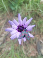 La catananche bleue, autrement appelée cupidone, fleurit de juin à septembre. Elle affectionne les bords de chemins, les prairies sèches et la garrigue. C'est une espèce plutôt commune, présente dans la moitié sud de la France. Sa couleur bleue/violet en fait une une fleur très jolie à observer. Vous remarquerez peut-être certains insectes venant la butiner comme celui présent sur la photo : la zygène de la spirée, insecte de la famille des papillons. Sa couleur noire et rouge repousse les prédateurs en les avertissant de sa toxicité (son corps contient du cyanure).