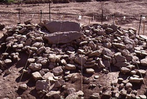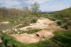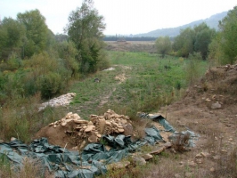 L’excavation située en contrebas correspond à l’emplacement originel du dolmen néolithique reconstitué 500 m en amont à l’abri des crues du Calavon. Celle de 1994 l’avait mis à jour par érosion des berges qui ont reculées ici de 40 m sur une distance de 150 m. Implanté côté Ubac, ce monument funéraire de 3 000 av. J.C renfermait une cinquantaine d’individus de tous âges et sexe, inhumés en position contractés, les membres inférieurs repliés et ramenés près du tronc.