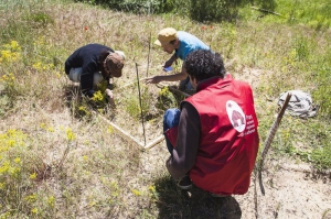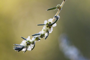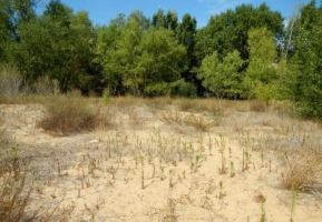Les terrasses alluviales bordant le Calavon sont colonisées par des plantes herbacées dont la rarissime et protégée Bassie à fleurs laineuses. Cette espèce steppique des zones sableuses semble se maintenir en France uniquement dans le Vaucluse, et plus particulièrement sur le Calavon, entre Apt et Robion (15 sites connus sur les 19 de l’hexagone). Ici, en contre bas de ce chemin, un programme de confortement et de suivi de ses populations est mis en oeuvre sur des terrains du Parc du Luberon.