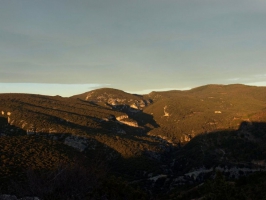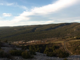 Voyez aussi le grand massif des Monts-de-Vaucluse, grande dalle calcaire très épaisse (plus de 1000 m). Il collecte, en profondeur, les eaux de pluie qui vont ressortir à Fontaine-de-Vaucluse, 1ère source de France par son débit. Sur leur rebord sud, les Monts-de-Vaucluse sont entaillés de canyons comme celui de la combe de Lioux en face ou de Vaumale , à l'ouest. Ces canyons permettent de raccorder la circulation des eaux du plateau à celle du bassin d'Apt.