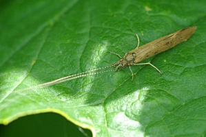 Sur cette section du ravin de la Grande Gravière, quand elle est bien en eau, une drôle de chose bouge en surface. Une sorte d’étui d’un centimètre environ d’où sort une tête. Il s’agit de larves de Tri-choptères, petits papillons de nuit à l’âge adulte, qui dans leur stade aquatique se logent dans des fourreaux mobiles qu'elles traînent avec elles en se déplaçant. Ces étuis, ouverts aux deux extré-mités, sont tissés en soie et recouverts de brindilles de végétaux agglutinées ou d’agglomérats de petits minéraux de sable ou de gravier. Les Trichoptères sont d’excellents indicateurs de la qualité de l’eau.