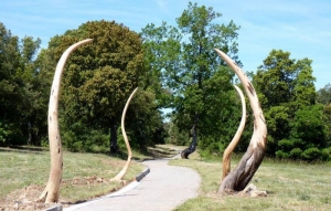 Réalisées par Xavier Ott elles sont installées le long du parcours, à la fois visuelles, auditives et tactiles pour tous. L'artiste explique que dans notre monde où le visuel a une place si importante, concevoir une œuvre accessible aux non-voyants demande d'imaginer comment ces personnes perçoivent leur environnement ? "J'ai pensé à l'écoute, avant le toucher", dit-il. C'est ainsi qu'est née l'idée de l'Ecoutoir, un amplificateur de sons. Dans l'œuvre de Xavier Ott, il y a également des "Volutes" réalisées à partir d'arbres tortueux lissés et sculptés.