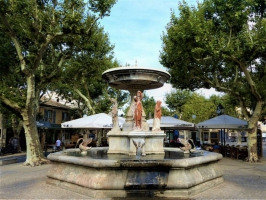 Construite vers 1869 par l’architecte avignonnais Louis Astruc, elle est un chef-d’œuvre inattendu pour un village qui ne comptait alors que mille huit cents habitants. Au centre d’un grand bassin, s’élève un pilier supportant une vasque. Autour, quatre figures féminines représentent les quatre saisons. A l’origine, elle faisait fonction de fontaine publique puis elle est devenue un lieu de rafraîchissement pour les terrasses des cafés avoisinants. Elle alimente aussi le lavoir Napoléon III, situé tout près.