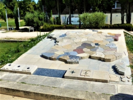 "Carte de France de la pierre de taille offerte par les carriers et tailleurs de pierre d'aujourd'hui en hommage aux carriers et tailleurs de pierre de jadis qui, érigeant cathédrales et châteaux, chapelles et modestes demeures ont bâti notre patrimoine commun: la France." Cette carte fait 5 m sur 5 et pèse 6 tonnes. Elle représente la France au 1/200 000e et compte autant de pierres différentes que de départements. Elle fut réalisée par l'association des "Compagnons Passants Tailleurs de Pierres".