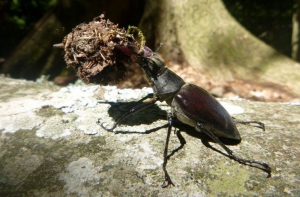 Lucanus cervus, espèce d’intérêt communautaire, est le coléoptère le plus grand d’Europe. Les mandibules du mâle, semblables au bois de cerf, lui ont valu son nom commun. Ces énormes mandibules, utiles pour l’accouplement mais handicapantes dans la vie de tous les jours, donnent au mâle un vol très caractéristique observable au crépuscule : en position verticale, lourd et bruyant. Ses larves se nourrissant de bois mort, le lucane est intimement lié aux vieux arbres, essentiellement aux chênes.