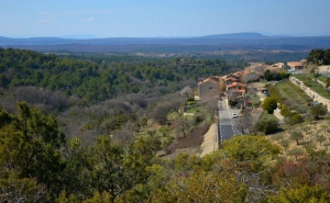 Vue sur le village et au loin la Sainte Victoire. Le village est à visiter pour ses passages voûtés, ses façades remparts et ses belles maisons anciennes qui ont la particularité de posséder presque toutes des caves voûtées avec un puits intérieur (jadis alimenté par les eaux de ruissellement).