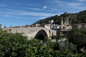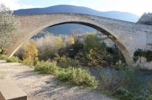 Le pont de Nyons a été construit en 1399-1400 à l'initiative des édiles locaux, mais ce projet a mis près de 60 ans pour se concrétiser. Guillaume de Pays, de Romans, fut le charpentier du chantier et Jean Felisson, originaire des environs de Grenoble, l'architecte et le tailleur de pierre. C'est un des plus beaux exemples en Europe de ponts à arche unique : elle surplombe la rivière de près de 20 m et son ouverture est de 40,5 m. Il est classé comme Monument historique depuis 1925.