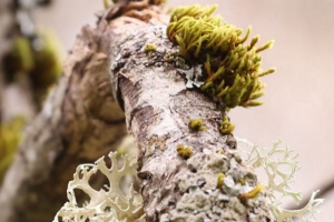 Les mousses et les lichens qui habillent les arbres de ce versant ombragé sont des végétaux dit "épiphytes" (qui poussent sur d'autres plantes) et ne constituent pas des parasites pour leurs supports. Les lichens sont le fruit d'une symbiose entre un champignon et une algue. Les tapis de mousse et "touffes" de lichens qui colorent le bois de cet ubac (versant n'étant pas frappé directement par le soleil) témoignent du fait que ces végétaux apprécient principalement les secteurs humides et frais.