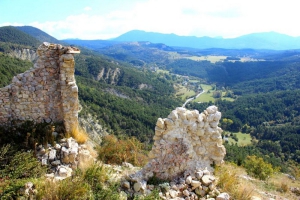 Depuis les ruines du hameau de Ville vous avez un magnifique point de vue sur la vallée et le village, avec ses cultures, ses forêts denses, et les montagnes au loin.