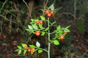 Recherché à Noël, cet arbrisseau vert sombre présente des fruits rouges insérés au milieu de fausses feuilles épineuses qui sont en réalité des tiges aplaties appelées cladodes. Ce sous-arbrisseau persistant dépasse rarement les 80 cm de hauteur. Ses fleurs, très petites, sont couleur crème. Ses baies, sont décoratives, mais toxiques. Dans l’antiquité, ses jeunes pousses tendres étaient cueillies ou consommées comme celles de l’asperge sauvage, ses graines étaient un succédané au café.