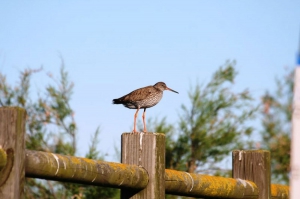 Cet élégant limicole est facilement reconnaissable à sa taille moyenne (environ 25 cm), à ses longues pattes et à son bec orange vif. Son plumage brun laisse apparaître une zone blanche bien visible sur le dos. Son chant flûté, aux accents doux et bisyllabiques, est caractéristique. Les theys du Mazet et du Levant accueillent chaque année plusieurs couples nicheurs, les premiers arrivant dès le mois de mars. La période de reproduction s’étend jusqu’en juillet. Les nids, très discrets, sont dissimulés au sol ou dans les touffes denses de salicornes.
