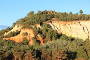 De ce chemin en balcon, on distingue des falaises colorées qui se détachent des collines boisées de cette vallée agricole où dominent les vignes. Résultant d'une formation géologique particulière et d'une exploitation humaine passée, ces fronts de taille sont menacés par la reconquête forestière. Depuis la fin de l'exploitation de l'ocre, la végétation a peu à peu envahi le Colorado de Rustrel. La colonisation de pins sylvestres (fortement combustibles) est devenue un enjeu paysager mais aussi sécuritaire. En 2015, des coupes d'arbres ont été réalisées pour redonner à voir l’ocre dans le site mais aussi dans le grand paysage.
