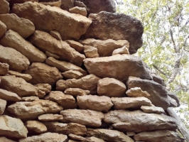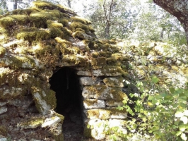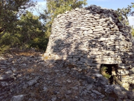 Ici de chaque côté des deux murs, se cache sous les broussailles une multitude de petites bories. Une borie est une construction originale par l’emploi unique de la pierre et sa technique de montage. Le couvrement ou la voûte est dite en encorbellement ; c’est une technique qui consiste à poser les pierres en assise avec dépassement de la rangée supérieure sur l’inférieure. Les plus anciennes se seraient écroulées suite à leur abandon. Celles encore en place n’auraient pas plus de 3 ou 4 siècles.
