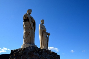 Son choix se porta sur le site de Méouilles dont il fit restaurer l’église à grand frais. Mais cette action, saluée par l’ensemble des habitants, ne lui a pas suffi. C’est pour cette raison qu’il commanda ces deux statues monumentales. Il paraît même, mais rien n’est certain, qu’elles font fonction de reliquaires, certains ossements des apôtres se trouvant à l’intérieur. La première pierre de l’imposant piédestal qui les supporte fut posée en 1891. Les statues l’y rejoignirent l’année suivante.