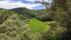 Les vignes du Domaine Dalmeran occupent le fond d'un vallon fertile creusé par le gaudre d'Almeran, un cours d'eau temporaire formé par les eaux de ruissellement du massif.En pénétrant profondément dans la pinède, le vignoble joue aussi le rôle de coupe-feu en cas d'incendie : ces milieux ouverts et débroussaillés ralentissent la propagation des flammes.