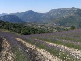 Suivre la pente. Sur cette parcelle de lavande on observe comment les lavandiculteurs s'adaptent aux contraintes géographiques de leurs parcelles. La récolte de la lavande nécessitant le maniement d'outils sur le rang et de remorques fortement chargées, la plantation dans le sens de la pente est aujourd'hui la meilleure option pour exploiter ces secteurs en pente et éviter des situations dangereuses avec des outils risquant de se renverser.