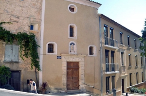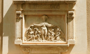 De l’autre côté de la rue, l’ancien hospice ou Hostel-Dieu, accueillait malades et pèlerins de Compostelle en remplacement de l'ancienne maison qui a servi d'hôpital à l'intérieur des remparts jusqu'au milieu du XVIe s. Le bas-relief, au-dessus de la porte, représente saint Jacques couvrant de son manteau pèlerins, malades et estropiés. L’inscription rappelle le décès de Jehan Ripert de Monclar, qui fit de l’hospice son légataire universel en 1616.