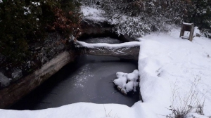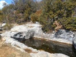 De chaque côté de la piste, trônent de beaux bassins à ciel ouvert, creusés ingénieusement de main de l’homme à même la roche. L’aiguier situé en amont de la piste est coupé en deux par une arche de roche ; on parle ainsi d’aiguier besson ou ‘’jumeaux’’ (« bessoun » en provençal, du latin "bis" = deux fois). L'arche centrale était sans doute destinée à supporter le départ de deux voûtes encorbellées en pierre sèche permettant de couvrir l'aiguier afin d’améliorer la qualité de l’eau destinée principalement à l’abreuvement des troupeaux de moutons.