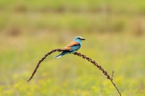 Le Rollier d'Europe (Coracias garrulus) est un oiseau aux vives couleurs turquoises. Il a l'habitude de se percher en terrain découvert et de s'élancer pour capturer les insectes sur terre ou même en vol, mais il est maladroit au sol. Ce sont les pirouettes de son vol nuptial qui lui ont valu son nom. A cette occasion, son plumage apparaît dans toute sa splendeur. Dès le mois d'août, il migre vers le sud de l'Afrique. Sa route passerait par la Méditerranée et le Sahara.