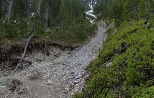 Borne 9Vous venez de traverser une zone caillouteuse en cuvette. Il s’agit du chenal d’écoulement d’une lave torrentielle. Lors de pluies violentes, les éboulis se chargent en eau et, parfois, se mettent en mouvement. La coulée emporte beaucoup d’éléments et peut être très rapide. Gare aux orages ! Sur le versant opposé, d’autres chenaux de lave torrentielle sont visibles. Ils peuvent également être utilisés par les avalanches en hiver. Cherchez-les ! On voit bien ici le rôle de protection du sol de la forêt.