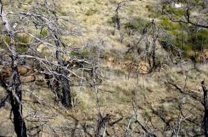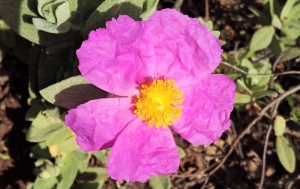 Ici en 2005, un gros incendie a ravagé l’ensemble du vallon de La Buye. En général, le cortège de plantes présent avant le feu se reconstitue après 10 ou 25 ans. Mais certains secteurs subissent l’incendie si fréquemment que les plantes favorisées par le feu, les plantes pyrophytes, finissent par occuper prioritairement l’espace au détriment de la biodiversité. Sur les talus en bord de piste, malgré les travaux de débroussaillement et broyage préventifs à la lutte contre les incendies, perssite des cistes blancs (Cistus albidus), une des plantes pyrophytes.