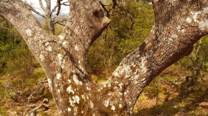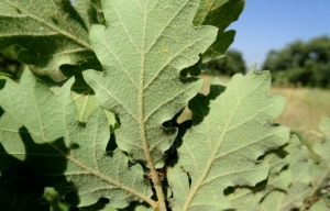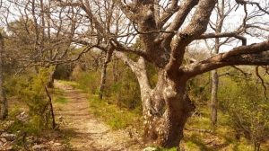 Ici se dresse un très beau Chêne pubescent, ou Chêne blanc (Quercus pubescens). Très commun sur le Luberon, il doit son nom au duvet qu’il porte sous les feuilles et sur les bourgeons. Il perd ses feuilles, au contraire du Chêne vert ou du Chêne Kermès qui les gardent tout l’hiver. Par contre, les feuilles sèches persistent longtemps, accrochées aux branches, ce qui donne des paysages bruns jusqu’en avril quand les jeunes feuilles de l’année prennent la relève : on dit alors qu’il est marcescent.