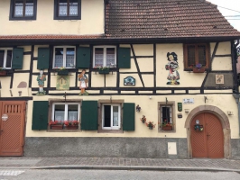 A deux pas de l'Eglise des Jésuites, dans le coeur de la ville de Molsheim se cache une maison bien insolite. On pourrait croire que c'est la maison de Hansel et Gretel car les deux personnages tiennent dans leurs mains des pains d'épices.Hélas, point de pains d'épices ! Par contre, une petite alsacienne indique aux visiteurs gourmands que les pains d'épices sont à découvrir un peu plus loin sur la Route des Vins d'Alsace, à la Maison Lips de Gertwiller.En y regardant de plus près, il y a bien une Bugatti sur le façade, c'est qu'on setrouve bien à Molsheim sur les terres d'Ettore Bugatti.Attention : lieu privé