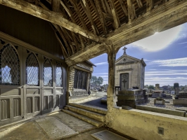 L’Aître de Brisgaret est un exemple rare en France de cimetière médiéval à galerie ayant conservé sa vocation d’origine. Le site comporte une galerie-ossuaire construite au XVIe siècle qui a conservé son authentique charpente. Elle est ornée de sculptures et de décors muraux représentatifs de l’art macabre.A l’extrémité se trouve une chapelle antérieure à la construction de la galerie et une originale croix gothique à l’emplacement du charnier.Cet ensemble monumental a nécessité un important travail de restauration entre novembre 2012 et juin 2014 qui a révélé le caractère exceptionnel du site.