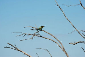 Dessus brun, dessous vert-bleu, gorge jaune à collier noir, ailes et queue vert olive, on croirait le guêpier échappé d’une volière exotique. Il creuse son nid dans les talus ou les berges de canaux où il vit en colonie. Son nom lui vient de son alimentation, composée de gros insectes : libellules, coléoptères et guêpes qu’il peut saisir sans se faire piquer grâce à son long bec. Agile, il écrase ses victimes contre son perchoir, éjectant ainsi le dard venimeux, avant de les offrir à ses petits.